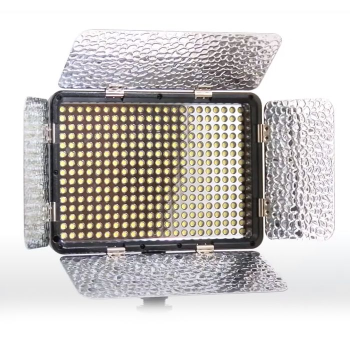 It features the latest LED-driven technology, and angle design barndoor reflectors to enlarge the illumination range and strengthen the brightness. The light is flicker-free, easy to use and reliable. It has a rotating knob to adjust brightness. The colour temperature is 5500K, but changeable with the included filters. The light uses a Sony NP-F series battery (not included) as a power source, and has a battery capacity indicator.