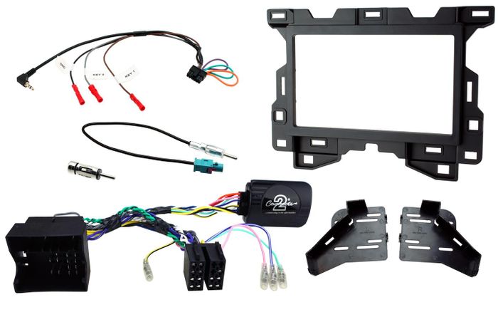 Mercedes Sprinter 2018-2021 full car stereo installation kit includes a matte black double din fascia, steering wheel control interface, antenna adapter and universal patchlead.
