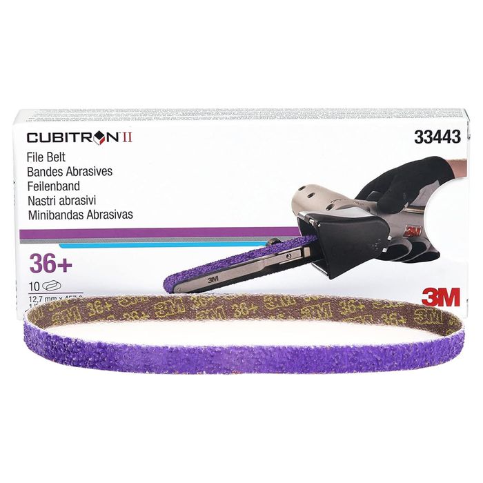 3M™ Cubitron™ II File Belt 786F is a 3M best-in-class abrasive belt, designed for use with the 3M™ File Belt Sander, for tasks like grinding out rivets and removing spot welds. 3M Precision Shaped Grain is resin-bonded on a heavy duty backing for a more consistent finish, cooler operation and two times more belt life. The resin bond and a grinding aid keep this belt cutting cool and sharp.