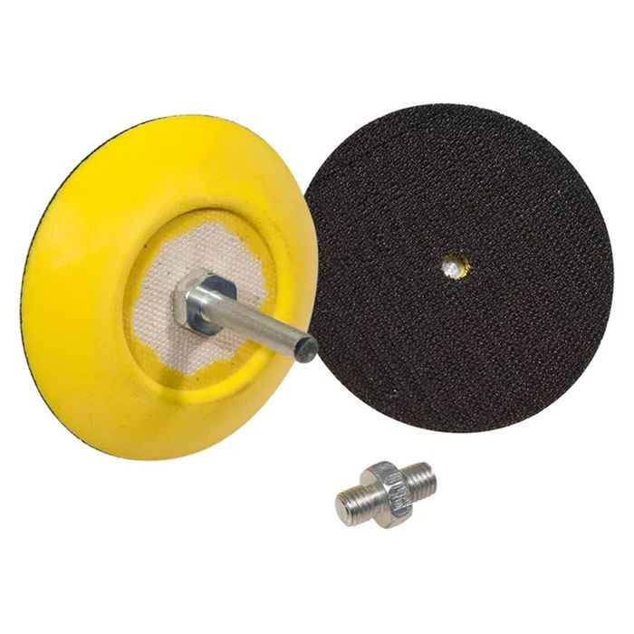 Versatile 75mm backing plate with interchangeable adapters; one makes the plate a drill chuck backing plate and the other makes it a pneumatic backing