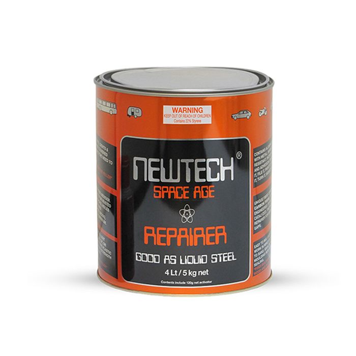 Newtech® Repairer is a polyester-based glass-fibre paste and hardener. The paste and hardener are supplied separately, and once mixed it becomes a user-friendly filler which is ideal to repair damaged alloy, metal, masonry, stone, aluminium and fibreglass parts real fast. It also contains rust inhibitor, aluminium and fibreglass strands which provide excellent bridging properties and reduce sagging for covering those large holes. No need to weld-in patches. The cured colour is a dark grey.