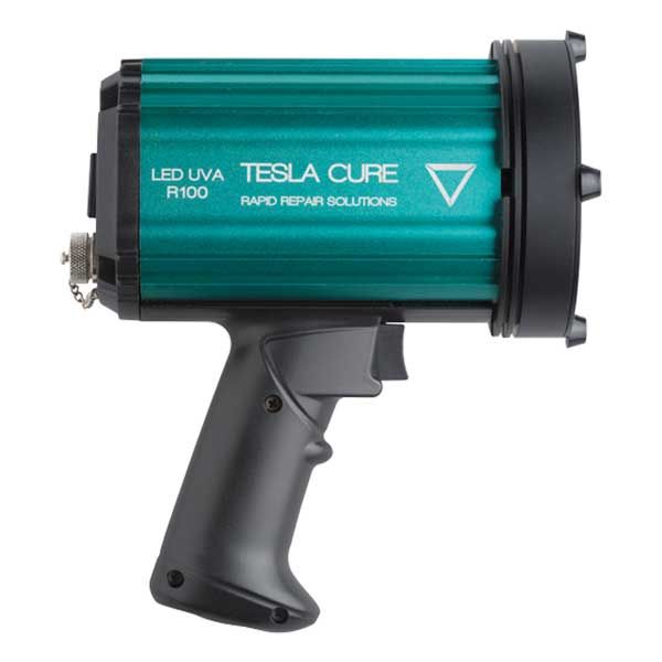 The TESLACURE handhelp cordless LED UVA R100 is developed for use with UV cured primers & clearcoats. Maximum cure area is 1 panel: (Door, wing, quarter or bumper) also all inner panel areas such as wheel arches, inside door & boot wells. The r100 comes with a UK 220-240 volt charger kit and UVA safety glasses.