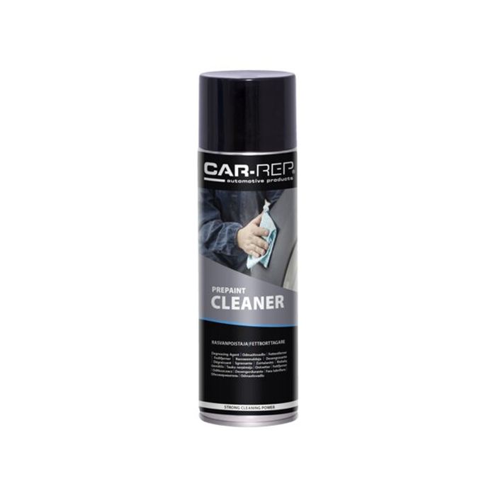 CAR-REPĀ® PREPAINT CLEANER is formulated to remove oil, grease, wax, silicone, sanding residue and other surface contaminants from bare metal, primer and plastic. It reduces static build-up, which helps check dirt nibs and minimizes the need to wet sand and buff. Spray till the area is covered and wipe dry with a clean soft cloth.